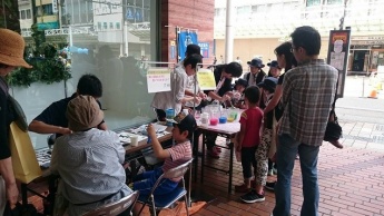 今回ALL工大プロジェクトチームでは、6月に引き続き、「屋台おでんde地域活性化」という地域活性化プロジェクトの一環として、7月5日、西武福井店の正面玄関にて、スライムづくりや書道教室のワークショップを行いました。