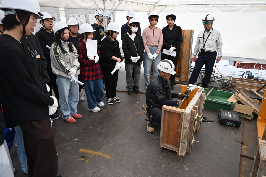 大学で「施工」(建物の作り方)を座学で学んでいる学生(建築コース3年生)が、実際の建築現場にお邪魔して、鉄筋・型枠・コンクリートの施工状況を見学、さらに今回は職人さんから指導を受けて組立体験までさせていただきました。