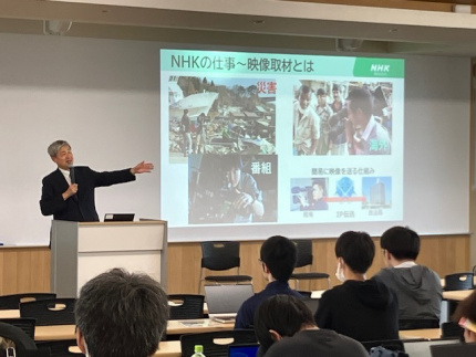 講義冒頭、NHKの仕事内容として、人々の命とくらしを守るために、迅速正確な情報提供を行うことや、人生を豊かにする多様な番組を放送していることを紹介されました。