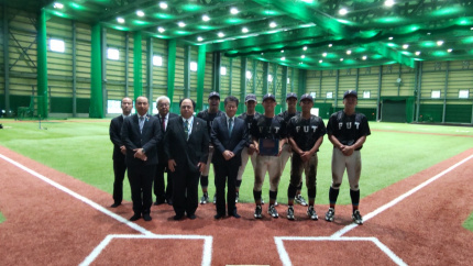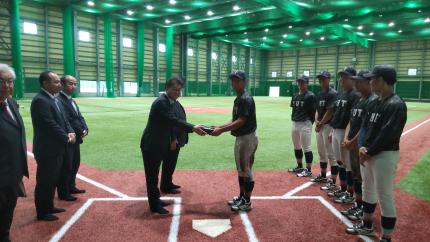 お知らせ NEWS & TOPICS トップページ お知らせ お知らせ 本学同窓会より大学硬式野球部に医療機器を寄贈して頂きました。 2025.09.16 本学同窓会より大学硬式野球部に医療機器を寄贈して頂きました。 令和7年9月13日(場所:本学カール・マイヤーグラウンド室内練習場内)、第74回全日本大学野球選手権大会で準優勝した本学硬式野球部に対し、本学同窓会(会長 水元一暁 様)より「医療機器1式」を寄贈していただきました。 野球部代表として、山田 久敬キャプテン(経営情報学部/経営情報学科3年生)が受け取り、感謝の意を表しました。 今後とも、硬式野球部へのご声援・ご支援のほどよろしくお願いいたします。 お問い合わせ:社会連携推進課 PREV 一覧に戻る NEXT