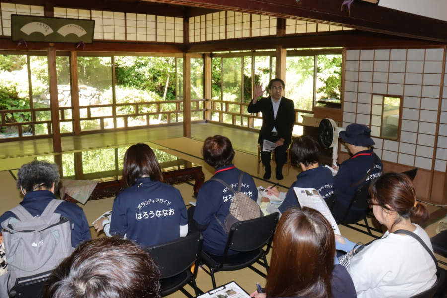 先の9月27日(御便殿の記念日)に、七尾市と石川県の観光関係者やボランティアガイド、地元の観光協会・住民など30名程が参加した見学会が実施され、案内役の市川教授は、この建築遺産の重要性と今後のまちづくり活用策を丁寧に解説した。