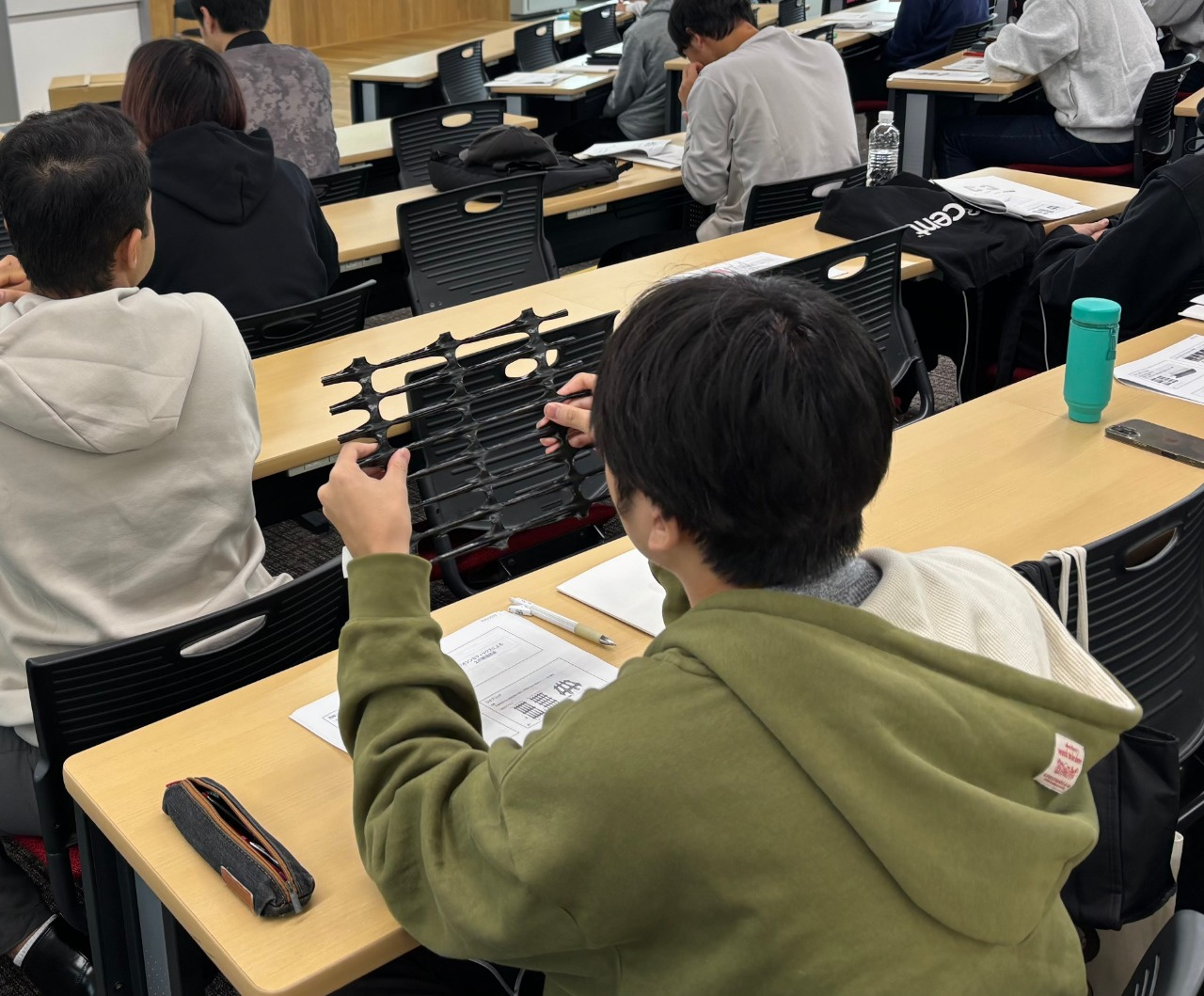 初めに、土の性質や古代の盛土〜現在の盛土技術についての説明があり、土の安定のために用いる「ジオシンセティックス」のサンプルを用いて、学生が実際に素材に触れながら学ぶ貴重な機会となりました。