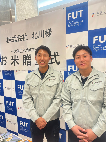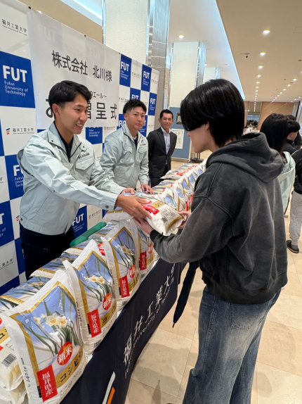 令和7年10月31日(金)株式会社北川 代表取締役社長 北川 聡様より、福井の新米を1人5kg(110人分)寄贈いただきました。北川社長の「地元の企業として、学生の皆様を応援したい」との思いから行われた新米の寄贈は、昨年度4月に引き続き2回目となります。
