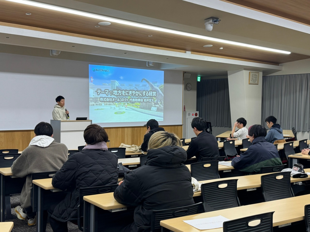 株式会社ALL CONNECT 代表取締役社長 岩井 宏太氏に「地方をにぎやかにする経営」のテーマでご講義いただきました。