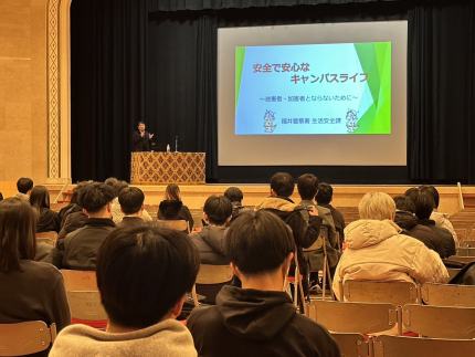 最後に、加害者になってしまった場合にどのような処罰を受けるか、また周りの人にどのような影響が及ぶかについてもお話しいただきました。学生たちは、安心・安全な学生生活を送るために、自分ができる防犯対策を行うことの必要性を感じた様子でした。