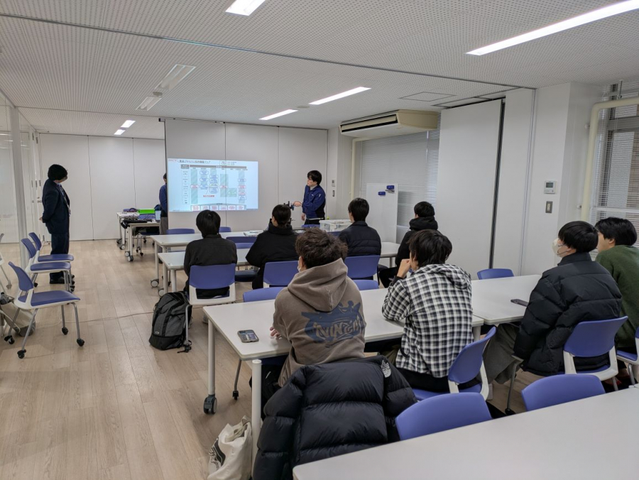 当日は,企業概要の紹介に続き,生産ラインにおける画像データを用いたキズ検出業務について,現場視点から詳しくご説明いただきました。テキストだけでは触れることの難しい,精度管理や運用上の工夫など,実務に根ざした内容に,学生たちは高い関心を寄せていました。