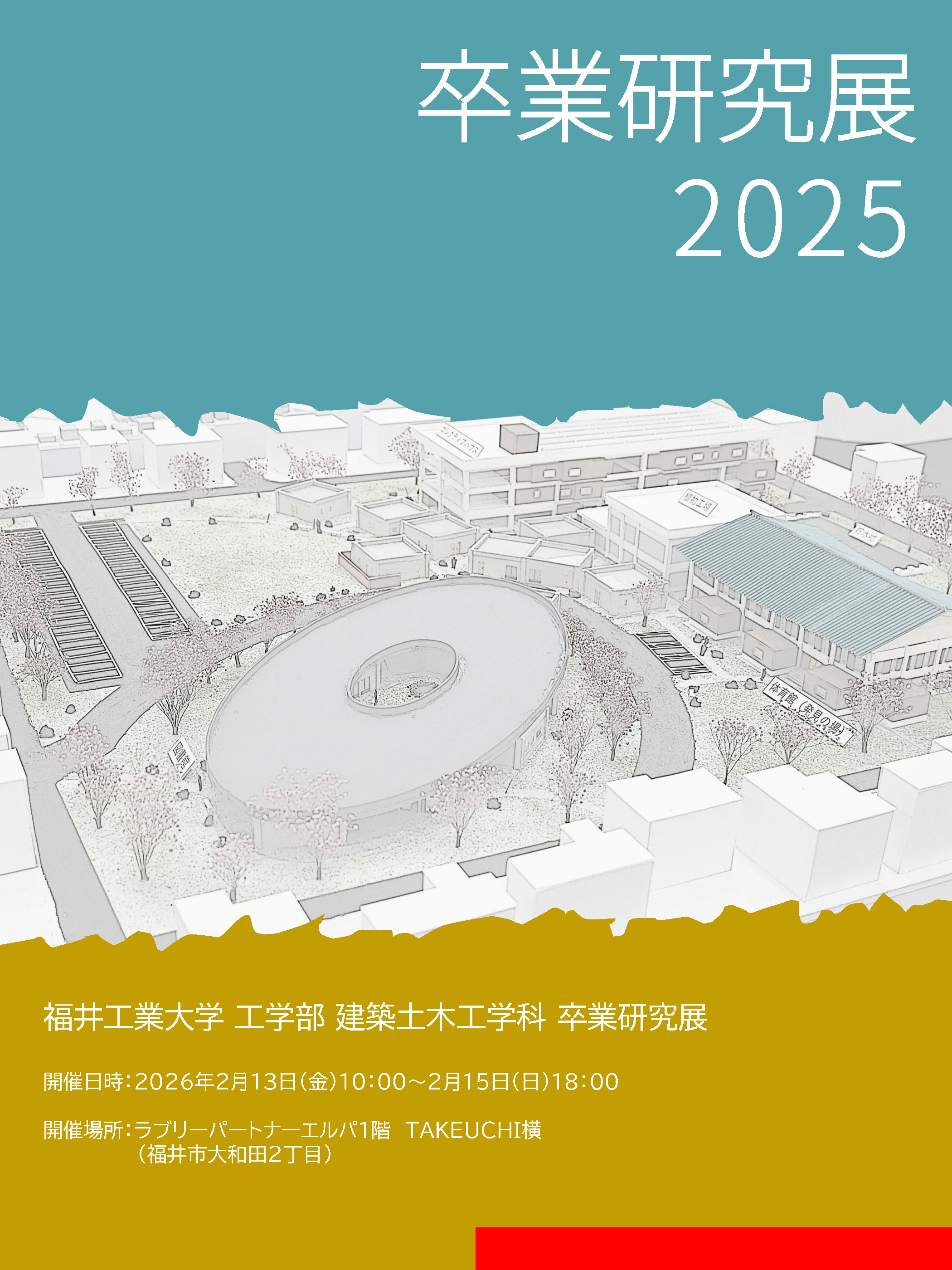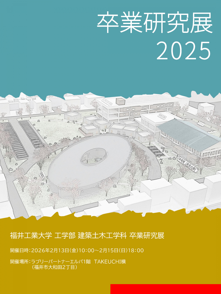 お知らせ NEWS & TOPICS トップページ お知らせ お知らせ 【建築土木】卒業研究展 開催案内 2026.02.06 【建築土木】卒業研究展 開催案内 2月13日(金)~2月15日(日)まで、建築土木工学科の卒業研究展をラブリーパートナーLpa1階で開催します。 建築設計のプレゼンや建築模型、研究論文などを展示します。 是非、エルパ(福井市大和田)までお越しください。 以下は昨年の展示会の様子です。 お問い合わせ:建築土木工学科 PREV 一覧に戻る NEXT