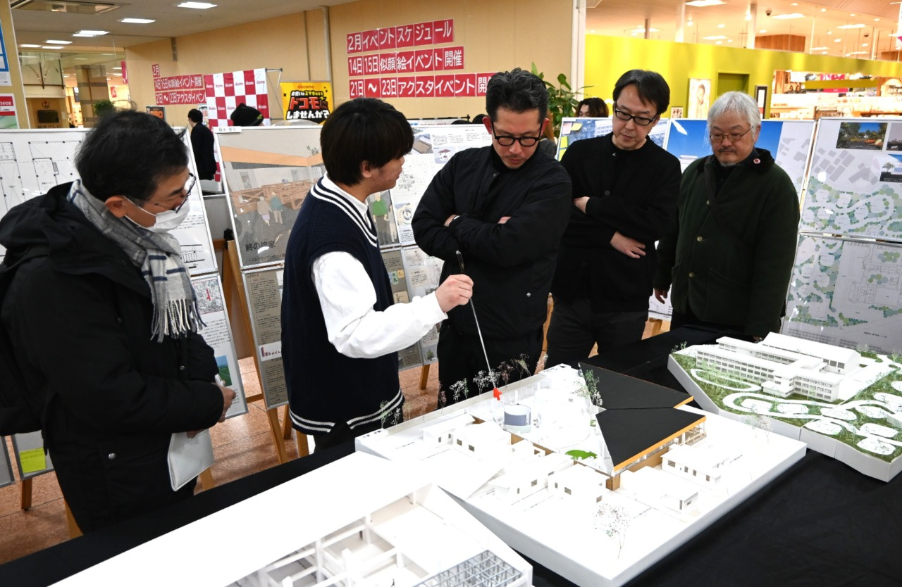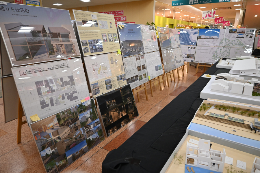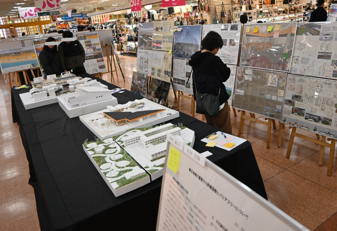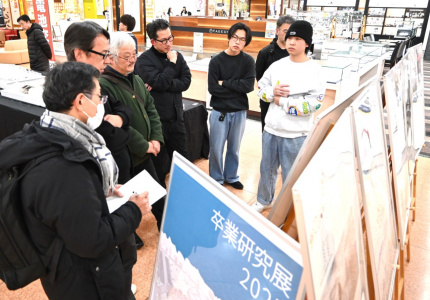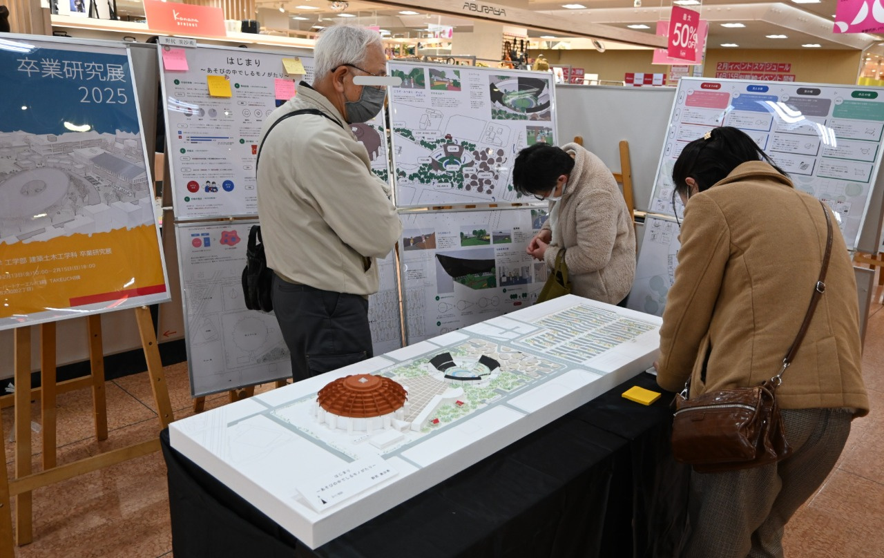 この春卒業予定の4年生有志20名が、1年間取り組んできた設計作品や研究論文をパネルや模型にして展示。
