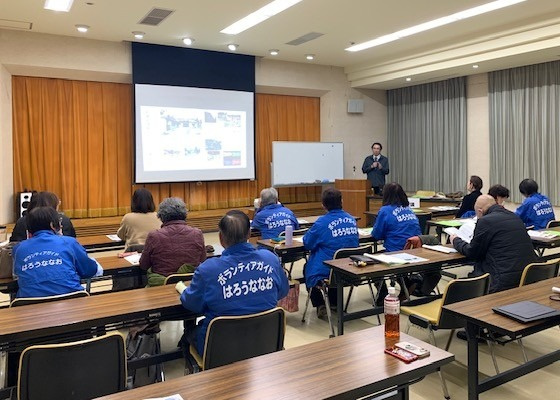 次のステップとして和倉御便殿のボランティア・ガイド養成を目的として、昨年9月27日(和倉御便殿記念日)の市川教授による現地見学会を経て、2月14日午後から和倉温泉観光協会にて座学の養成講座が企画された。講師の市川教授は受講生20名にスライドを使ってガイドのポイントを詳しく解説した。さらに3月末には受講生の試験ガイドが予定され、新年度からのツアーガイドの実現をめざす。