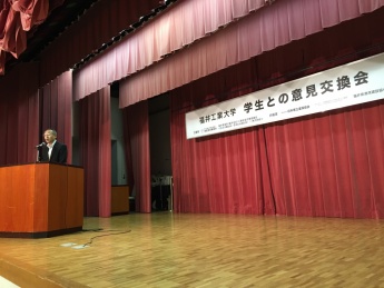 建築土木工学科の学生約80名を対象に、国土交通省北陸地方整備局敦賀港湾事務所が整備する福井港海岸保全施設護岸の地盤改良工事や離岸堤、福井石油備蓄基地などの現場見学を9月17日(木)に実施しました。現場見学会終了後には、現場第一線で活躍する土木・建築双方の建設会社や建設コンサルタント、公務員、女性技術者の5つのテーブルに分かれて意見交換会を行いました。これらは、学生の建設技術に関する知識を深め、併せて、建設技術者の仕事等について理解を図ることを目的としています。詳細は下記の通りです。