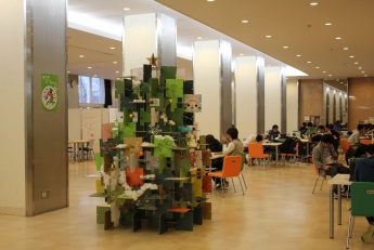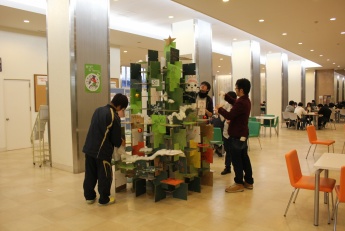 平成27年12月12日にクリスマスイベントとして、20cm×20cmのボードを使った創作クリスマスツリーを学生ロビーに設置しました。
