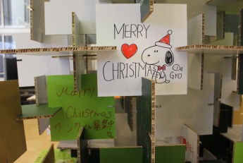 一枚一枚のボードには、学生がイラストやサンタへのお願い、友人へのコメント等バラエティーに富んだ内容が書き込まれており、豪華な創作クリスマスツリーが完成しました。