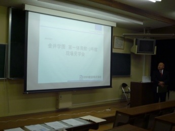 まず教室に集合した学生に向けて、村中建設株式会社 常務執行役員 北川様からご挨拶をいただいた後、建築グループ 総括所長 川畑様(本学OB)より工事概要の説明がありました。