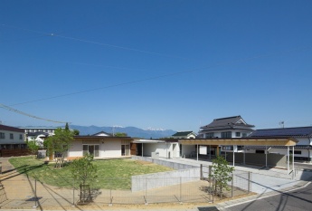 景観として特に配慮した点は、起伏のある芝生の丘やシンボルツリー(ソヨゴ株立ち)を配置し、住宅街において緑あふれる憩いの場を創出したこと、保育棟の外観を軒裏のサワラ板、木製デッキ、火山灰で塗られた外壁、木製建具などの自然素材をふんだんに用いたこと、保育棟を平屋にして北アルプスを臨む風景と合致させたことなどが挙げられます。
