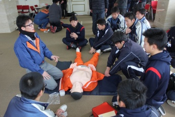 実際15階往復に約5分かかりました。この5分間ペアの学生は、心臓マッサージを続けていないといけない状況でした。非常に現実味がある事案を体験したことで学生からは、救命救急の重要さと大変さを実感したと体験を語っていました。