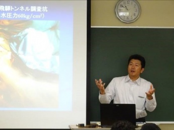 講演内容としては、福井県内で整備が進む北陸新幹線等での鉄道工事や、東海・北陸自動車道飛騨トンネルなどの事例を踏まえながら、ゼネコンの現場・設計・技術開発の仕事内容についてでした。また、企業が求める人物像として自ら考え自ら行動できる人などを具体的に挙げられ、学生たちは熱心に耳を傾けていました。