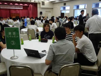 意見交換会では、現場第一線で活躍される方々が招かれ、建設会社(建築・土木)や建設コンサルタント、公務員、女性技術者のテーブルに分かれて意見交換会を行いました。