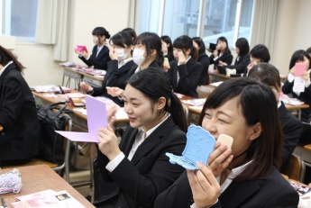 また、花王株式会社様には、女子学生に対して、就職活動において好印象を与えるメイクセミナーをしていただきました。就活用のメイクを実践し、おしゃれと身だしなみの違いを感じたようでした。これからの就職活動の第一歩に向かって、基本の身だしなみを身につけ自分らしさを出せる成長に繋がればと思います。