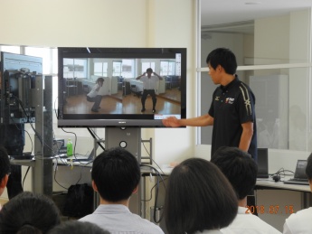スポーツ分野において英語を使うことの重要性が説明された。その後、参加者同士が質問をし合いながら、英語を話す授業が行われた。