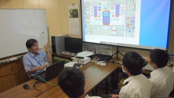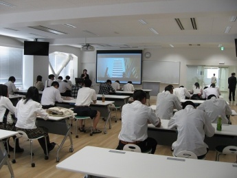 1.建築土木工学科の概要(市川、西川先生) 学科の特徴、授業、コース分け、研究室、資格、進路などについて概説しました。また、パネルによる研究室紹介も行いました。