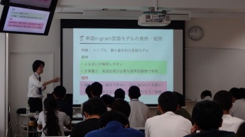 授業内容は、機械翻訳・音声認識などの基本的なしくみである「言語モデル」に関するもの。