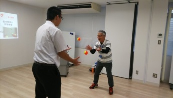運動学習によって技能・技術を身に着けるためには、その動作のポイントをわかりやすい表現(ことばがけ)で、分習法・全習法などの方法を使い分けながら効率よく行う必要があります。今回の模擬授業では、ジャグリング(お手玉)を題材にして効果的な運動学習の方法を実際に体験してもらいました。
