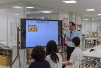 学科の全体紹介と各教員の研究紹介を行った後で、化学・環境・食品・バイオの四つの分野に分かれ、光化学と太陽電池、雨水利用、穀類・豆類とその加工食品、および食品に含まれる酵素についての模擬講義をそれぞれ実施しました。