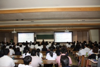 全体説明会では、掛下学長の挨拶に始まり、池田副学長より、私立大学研究ブランディング事業である「ふくいPHOENIXプロジェクト」等、本学の概要説明について紹介されました。また、本学の紹介動画が上映されました。