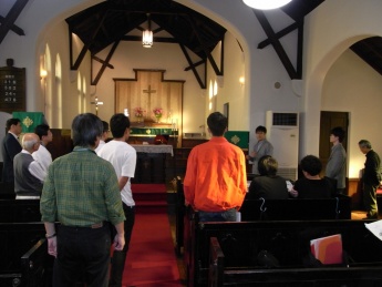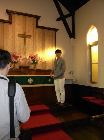 安田君は、戦後の再建に際して変更された構造と意匠について解説し、さらに山口君は、祭壇内のギリシア語と十字架を組み合わせたプロテスタント独特の装飾文様について解説した。参加者からの質問に丁寧に落ち着いて対応した安田君と山口君は、この学外活動の機会を踏まえて、今後さらに建築を深く学んでいきたいと熱心に語っていた。入学して間もない1年生の2人にとって専門への意欲をいっそう高める転機になったようである。これからの安田君と山口君を大いに期待したい。
