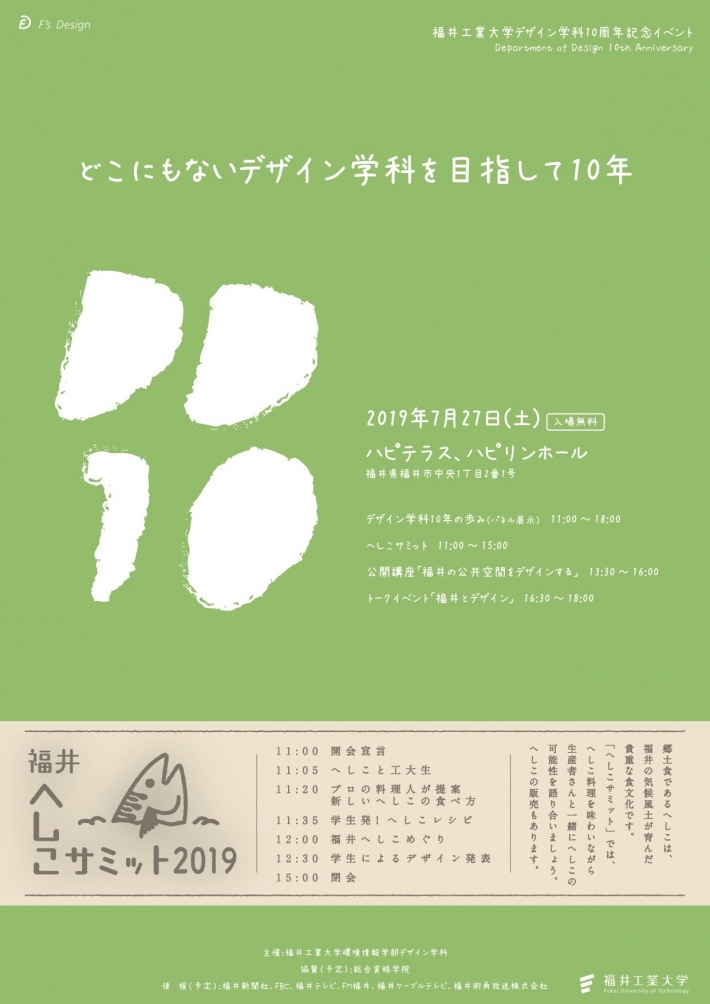 11:00 開場・デザイン学科10年の歩み(パネル展示)(〜18:00) 13:30 福井工業大学 公開講座「福井の公共空間をデザインする」(〜16:00) |