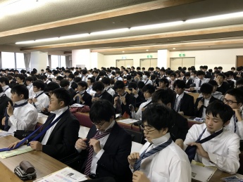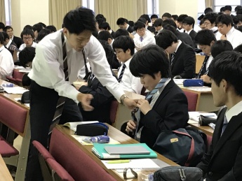 洋服の青山様にお越しいただき、就活の面接では、第一印象が大切だという説明を受けた後、スーツの着こなし方や、選ぶポイント、印象が良くなる身だしなみについて学びました。その後、男子学生は、ネクタイの結び方を指導してもらい、上手く結ぶためのポイントを聞いた後、一人ずつ実践してみました。ネクタイはビジネスシーンで目につきやすいため、まだまだ、不慣れな学生は、一生懸命チャレンジしていました