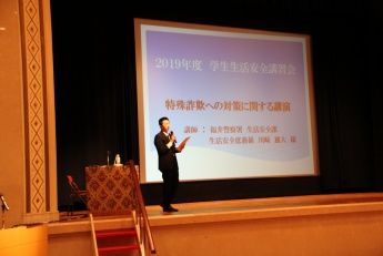 お知らせ NEWS & TOPICS トップページ お知らせ お知らせ 2019年度 学生生活安全講習会を実施しました。 2020.01.20 2019年度 学生生活安全講習会を実施しました。 2020年1月15日(水)、16日(木)、学生の生活安全に関する基本知識を学び、意識を向上させることを目的として、「学生生活安全講習会」を実施しました。 今回の講習会は「特殊詐欺への対策に関する講演(講師:福井警察署 生活安全課 正山涼介様、川﨑雄大様)」・「防火に関する講演(講師:福井市中消防署 予防指導課 藤井正俊様)」の2つのテーマにて行いました。 今回の講習会により、学生各自の普段の生活に対する意識向上につなげることが出来ました。 お問い合わせ:学務課 PREV 一覧に戻る NEXT