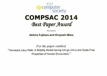 本学経営情報学科 藤原明広 准教授が,平成26年7月21~25日にスウェーデンのヴェステロースで開催された国際会議「The 38th Annual International Computers, Software & Applications Conference (IEEE COMPSAC2014)」に参加し,本会議において研究成果の口頭発表を行いました.またこの会期中に,関西学院大学の巳波弘佳教授と共著で投稿した発表論文(Akihiro Fujihara and Hiroyoshi Miwa, “Homesick Lévy Walk: A Mobility Model having Ichi-go Ichi-e and Scale-Free Properties of Human Encounters”)が,COMPSAC2014のBest Paper Awardに選ばれ,賞状を授与されました.受賞した研究論文は,人間同士の遭遇頻度に関する長期間の実験から得られたデータを解析することで明らかになった二つの基本的な統計則(1. 人間同士のすれちがいの大多数は一期一会である(実験期間中に一度しか機会がない), 2. 人間同士のすれちがい頻度分布はベキ乗則に従う(すれちがい頻度には人によって非常に大きな格差が存在する))を再現する最も単純な移動モデルとしてHomesick Lévy Walkを提案し,その数値実験や理論について調べた成果について発表したものです.この移動モデルは,人間同士のすれちがいの機会を利用して近距離無線通信することで情報転送する遅延耐性ネットワーク(Delay Tolerant Network)やモバイル日和見型ネットワーク(Mobile Opportunistic Network)の分野における通信の性能評価を行うための大規模数値実験への活用が期待できます.