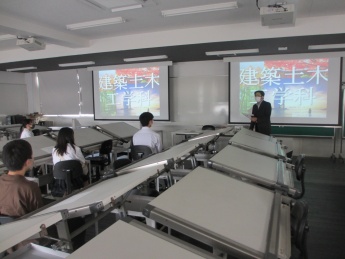 まず、学科・コースについて、特徴、授業内容、コース分け、資格、就職状況、業界動向などについて説明がなされました。続いて、プロジェクト紹介では、福井県と共同実施している、点検による橋梁の長寿命化について解説がなされました。最後に、大学3号館5階、4階および1階の建築土木工学科の実習室、演習室、実験室等を見学してもらいました。