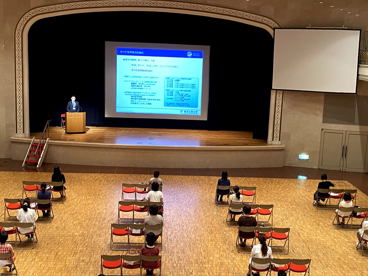 保護者説明会では、保護者の方を対象に、掛下学長から本学の概要説明、島田キャリアセンター長からキャリア教育と就職支援体制、学務課から学生生活・奨学金制度、入試広報課から令和3年度入学試験制度などについて説明が行われました。また、学生スタッフによる学生生活についてのスピーチがありました。