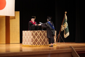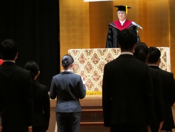 掛下学長は、式辞の中でコロナ禍の状況下で大学入構が制限される中、修士論文や卒業論文を作りあげ今日の日を迎えたことについて、中国の故事の一部『奇貨居(きかお)くべし』を例えに、誰もが経験したことのないこの困難に立ち向かい、乗り越えた経験を絶好のチャンス・財産と捉え、将来に役に立てて欲しいと述べました。