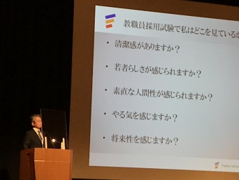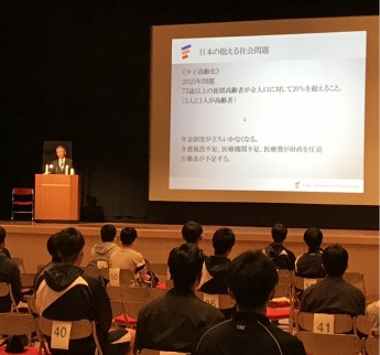 金井理事長は、『就職という岐路にそなえて』というテーマで、これから就職活動が本格化する学生に向けて、まずは日本の社会がどのような状況にあるのかを理解した上で採用試験に臨んでほしいと話され、今、日本が抱えている社会情勢や国際問題について触れられました。
