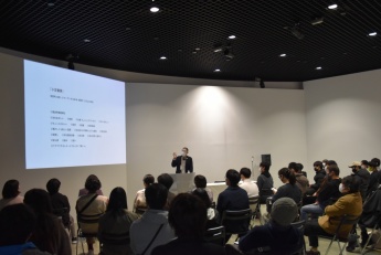 また、7日(最終日)にはアートディレクター・六感デザイン代表野路靖人さんの講演会も開催され、デザイン制作プロセスをご自分が関わった事例を通して、臨場感たっぷりにお話しいただき、デザインを学ぶ学生に対してたくさんのエールをいただきました。その後、実際に展示されている作品について講評もいただき、学生たちも真摯に聞き入っていました。