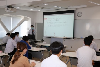 まず初めに学科主任の西岡先生より、大学および機械工学科の紹介がありました。その後、山下先生より、機械工学科のカリキュラムおよび各コースの履修モデル、主な就職先などについて説明しました。