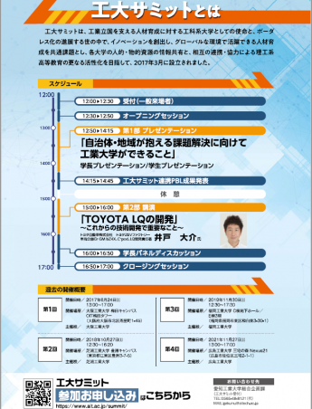 本学は令和元年12月に、工業系大学が参画する「工大サミット」に加盟しております。このたび、加盟大学が一堂に会し、「未来を創造する理工系人材の育成」をテーマに「第5回工大サミット」に参加します。