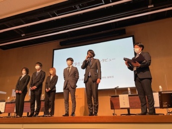 次に、令和4年度工大サミット連携PBL(広島工業大学)に、9大学63名の学生が参加し、1〜8班に分かれて広島県宮島にてフィールドワークを実施した中で、最も評価の高かった8班の「継ぐ町家-学生がつなぐ地域の拠点-」が選ばれ、発表が行われました。メンバーの一人であるデザイン学科 3年 谷島諒さんがインタビューで、「今回参加させて頂いたPBLでは、学内では得られない経験や刺激を受けることができました。専攻する学問の違う初対面の学生と協力して活動を行う中で、コミュニケーションの難しさや意見を合わせることの難しさに直面しました。しかし諦めることなくPBL実施日以外でもオンラインミーティングを行ったり、施設使用時間が過ぎても外で話し合いを続けるなど、最後まで諦めずやり切り、いい結果になったので自信になりました。」と参加した感想を述べました。