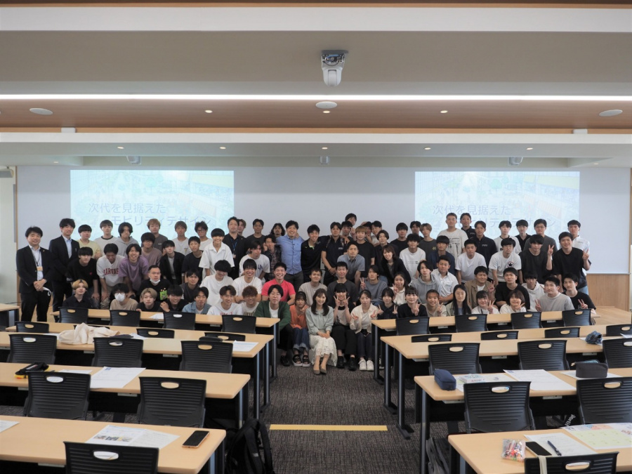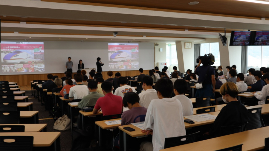北陸新幹線福井県内開業を見据えた講義を福井県未来創造部新幹線・交通まちづくり局と協働で実施しました。建築土木工学科1年生80名が受講する「建築土木概論」のなかで、吉村朋矩教授が担当する「次代を見据えた交通まちづくり」をテーマにした講義回で行ったものです。講義はワークショップ形式で行い、福井テレビの佐橋嬉香アナウンサー、FBCの川島秀成アナウンサーにも参加いただきました。