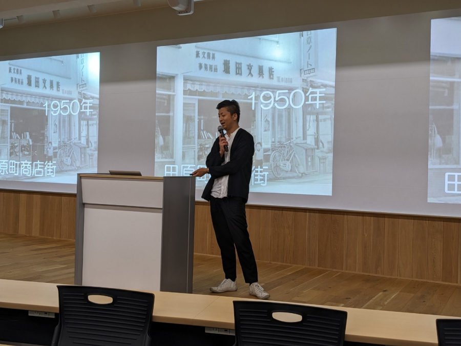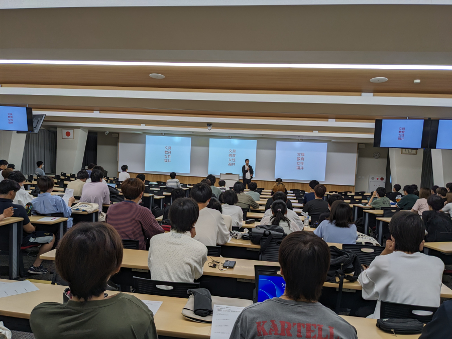 この講演会は、未来協働プラットフォームふくい推進事業(福井版PBL)に採択された事業(事業名称:「顧客満足度向上のためのサービスサイエンス的手法の実践・評価尺度の設計」)の一環で企画されたもので、県内における小売業の実態を1年生に伝え、新たなビジネスモデルの創出に関わる学生を発掘することを目的としています。