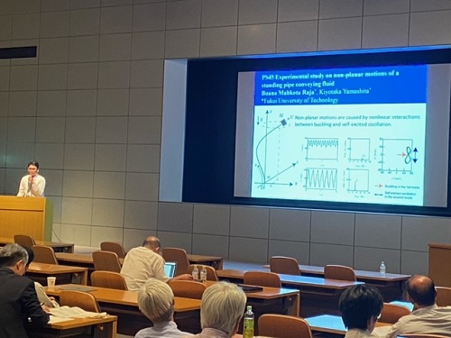 国際理論応用力学連合(IUTAM: International Union of Theoretical and Applied Mechanics)が主催する国際会議(2023 IUTAM Symposium on Nonlinear dynamics for design of mechanical systems across different length/time scales)が7/31(月)~8/4(金)の期間、つくば国際会議場で開催されました。本学からは、機械工学コース所属の2名の大学院生マコタさん(大学院博士前期課程)と田中さん(大学院博士後期課程)が研究発表を行いました。この学会は、海外から著名な先生方が集いシングルセッションで議論を深めることが特徴です。学生はそのような先生方と議論できる貴重な機会を得ることができました。