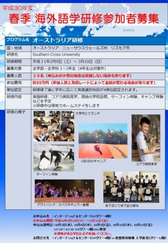 平成31年2月~3月にオーストラリアで実施予定の語学研修について、下記の通り参加者を募集します。