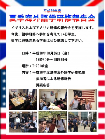 お知らせ NEWS & TOPICS トップページ お知らせ 在学生情報 夏季海外語学研修報告会について 2018.10.03 夏季海外語学研修報告会について 8月下旬~9月上旬にイギリスおよびアメリカで実施した海外語学研修の報告会を実施致します。 今後、語学研修へ参加を考えている学生、留学に興味のある学生はぜひ聴講してください。 お問い合わせ:インターナショナルセンター PREV 一覧に戻る NEXT