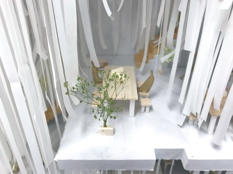 学内で選出された3名が参加した合同講評会は、福井県内4学科(2大学、1高専)の建築系の設計・実習で課された作品について学生自らが発表し、地元設計士4名が講評・審査するもの。学内で出されたテーマは『ライフスタイルショップ』。清水さんが提案したのは、忙しく働く20~40代の人をターゲットにした、主にベッドリネンを販売するショップだ。「人は一生の内で約1/4睡眠をしていると言われています。人生の大部分を過ごすベッドは、自分に合った素材にこだわりをもってもらいたいと、福井の良質な繊維を活かしたベッド理念の販売ができればいいと考えました。一日の始まりと終わりを心地よいベッドで過ごし、良質な睡眠をとり素敵に過ごせれば最高だと思いませんか」と清水さん。そよ風が吹き、木の葉が優しい音を聞きながらいつの間にか眠りに落ちている光景を想像し、「そよぐ」という言葉を軸に空間やショップの提案を考案。「そよぐ」という自然の揺れ動く姿を商品でもある布で表現した。ショップは空気の流れによって揺れ動く布が不思議と安らぎが感じられる空間となり、審査員からは「今すぐお店にできそう」という好評価が飛び出すほどだった。