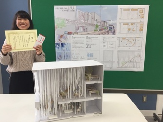 昨年12月に行なわれた日本建築学会 北陸支部 福井支所主催の合同講評会において最優秀賞を受賞したデザイン学科3年の清水香澄さん。「寝る間も惜しんで夢中になって取り組んだ作品が評価してもらえたことがうれしい」と笑顔をみせる。