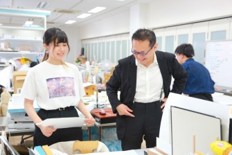 新設したデザイン学科の教育内容にも力を注いだ。「デザインの知識がある人を育てるのではなく、デザイナーを育てる」ことを目標に、授業の中心は手を動かす実習がメイン。実習中心にすることで、自分たちの手で作品を制作する能力を向上させている。また、大きな特色が1年中いつでも入れる「24時間開放のスタジオ」だ。学生同士がいつでも共に作業できる空間で制作することにより、切磋琢磨できる環境が生まれ、さらに先輩後輩の交流にもつながっている。そして学科内につくった「F’s Design Studio」は、地域の企業や自治体から依頼を受けて行うデザイン事務所。授業とは違い、社会と直接関わることで実務経験を積み、将来の仕事へつなげる取り組みだ。そのため、卒業生の約7割はデザイナーやクリエイターなどの専門職として、デザインを生かす仕事へと進んでいる。