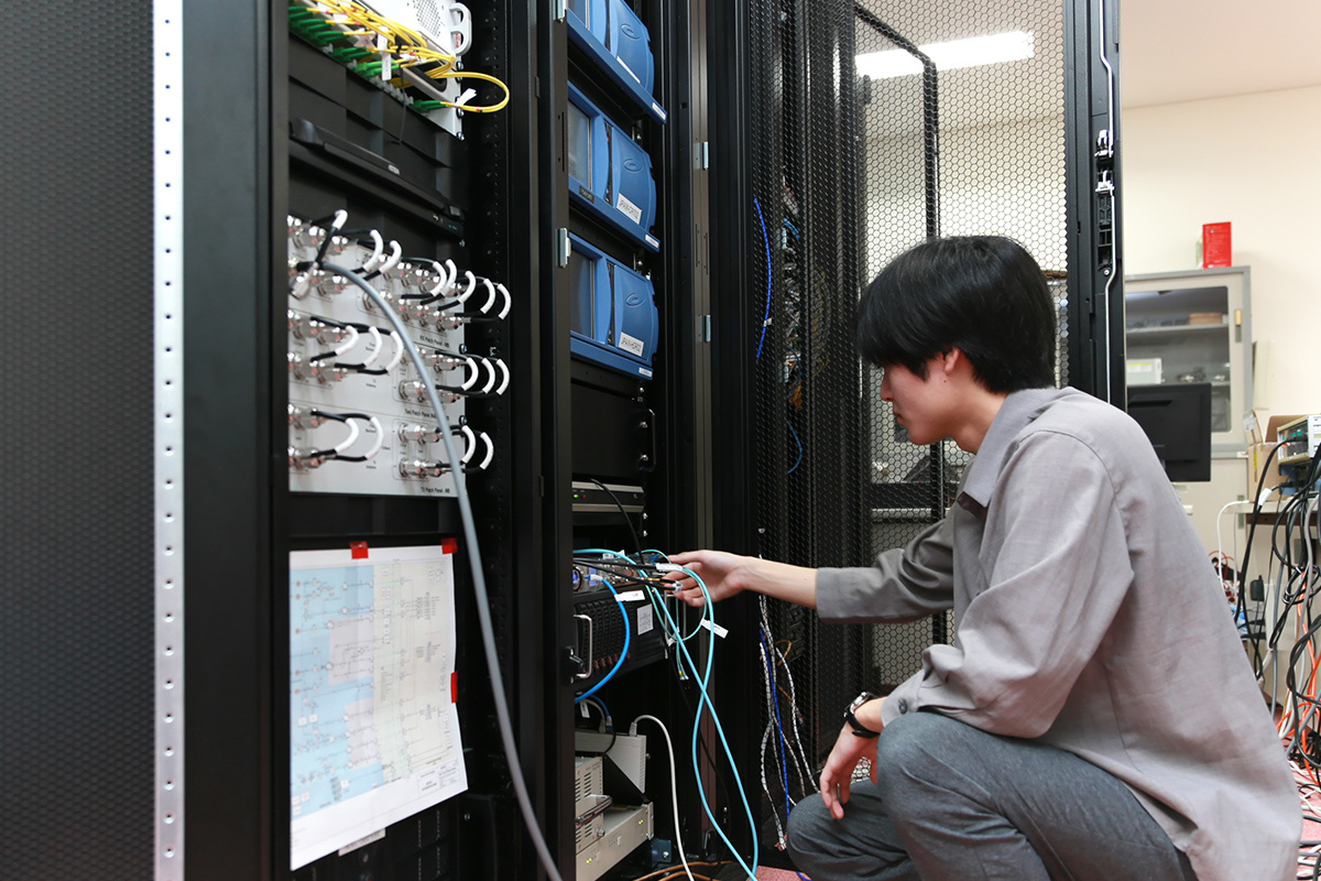 あわら宇宙センターで、アンテナの制御システムの研究に取り組む